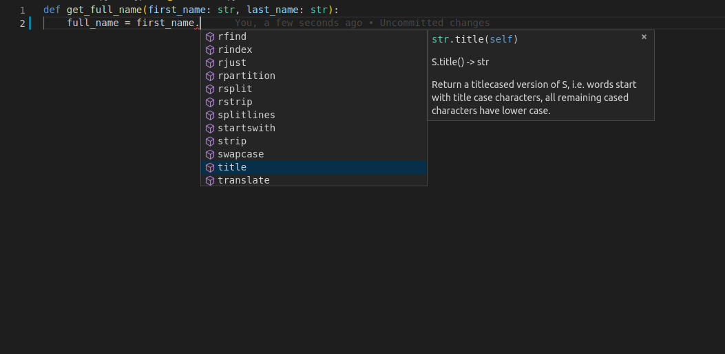 Você digita o primeiro parâmetro da função, first_name, depois um ponto (.) e, em seguida, pressiona Ctrl + Space para acionar a conclusão.